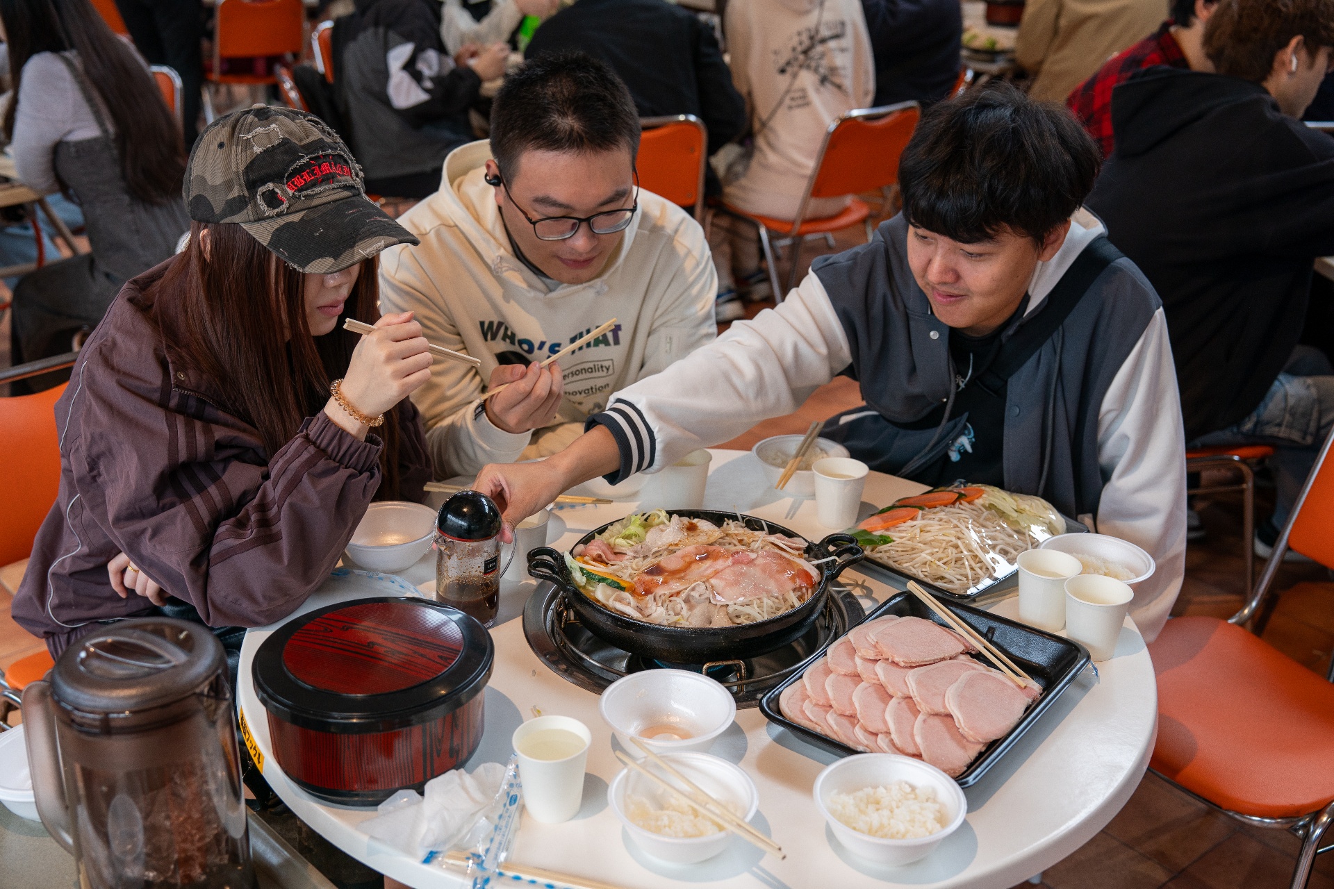お昼前に到着した学生たちは、まずお楽しみのバーベキューでランチ。自分たちで肉や野菜を調理して食べます。学校で勉強するときの真剣な態度とは打って変わって、このときばかりはみんな大はしゃぎで食事を楽しみました。