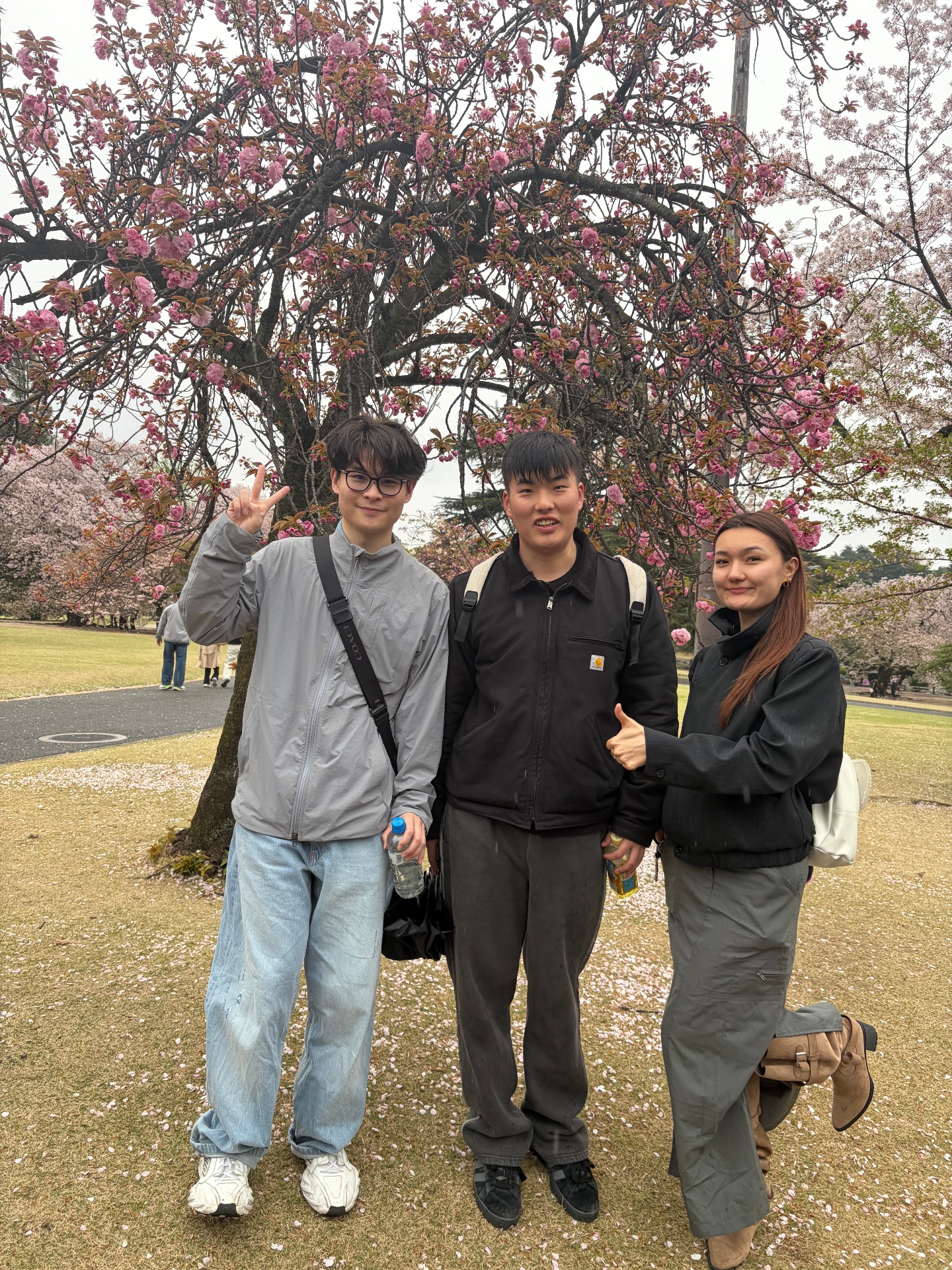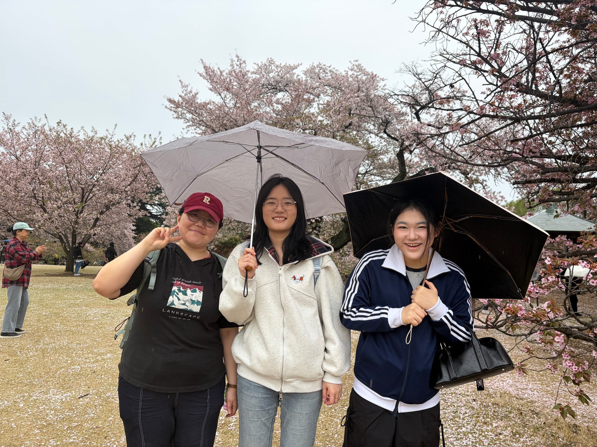 学生们都纷纷感叹:“花瓣飘落的瞬间好美,让我想起了以前看过的日本动画片。”“花瓣在空中飞舞时,仿佛下起了樱花雨,好浪漫。”“雨天的景色显得格外柔和,可以拍出独具氛围的照片。”“这是我第一次看到樱花如飞雪般铺满天空,真切感受到了日本文学中‘短暂而美丽’的意境。”在花雨纷飞的世界中,大家度过了一个充分体验日本独特赏樱文化的美好一天。